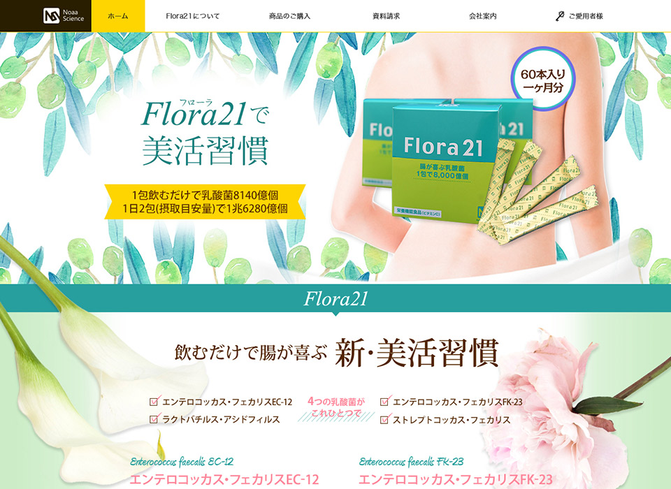腸を美しく整える健康食品を通販されている、ノアサイエンス様のコーポレートサイトをリニューアルさせて頂きました。既に幅広い年代の女性のお客様が多数いらっしゃるので、守備範囲の広いオーソドックスな美しさ、華やかなデザインをご提案させて頂きました。