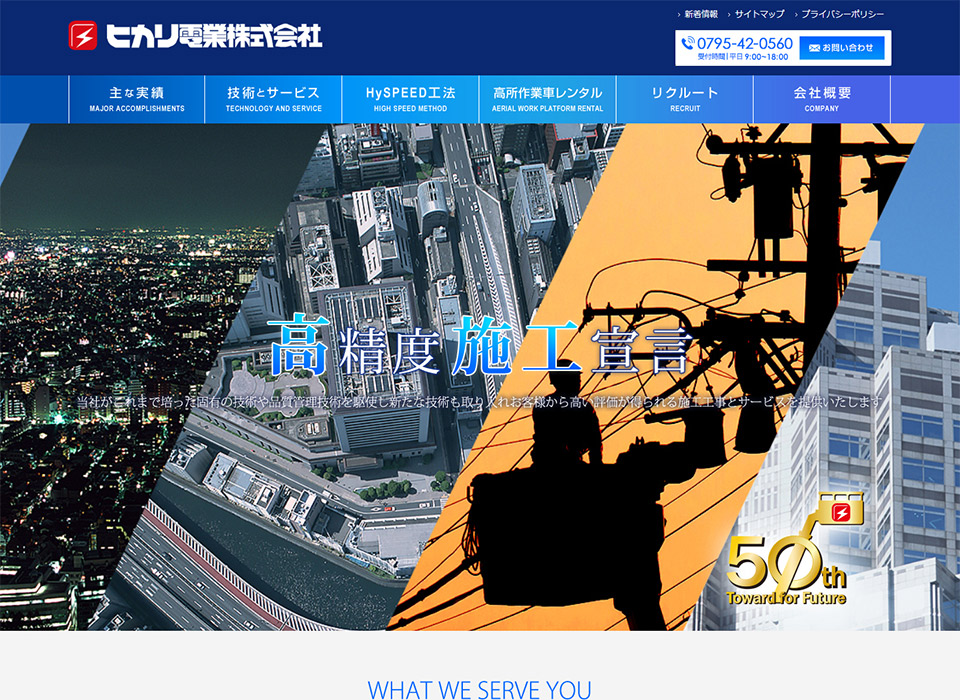 電気設備工事部門、重機械工事部門、高所作業車のリース等、様々な分野でご活躍されているヒカリ電業様のコーポレートサイトをリニューアルさせて頂きました。「プロフェッショナルだけど親しみやすい」をテーマに、作業中の写真をたくさん使い、地域に貢献していることがお客様に伝わるようにしました。