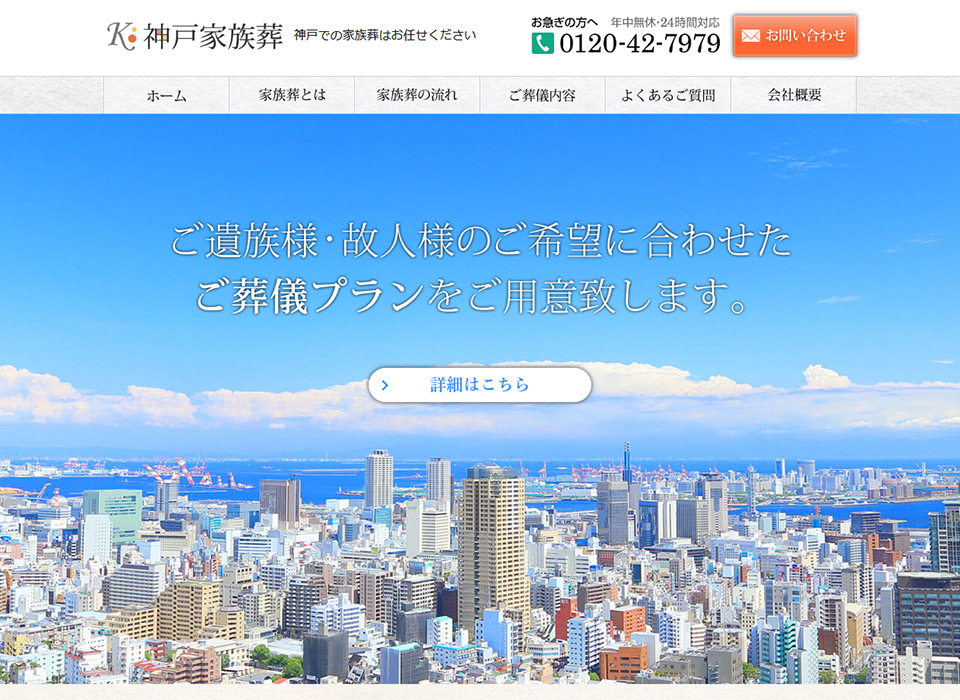 神戸祭典様が経営されている、家族葬専門サイトを作成させて頂きました。パック葬やセットプラン等は設けておらず、ご遺族様・故人様のご希望に合わせたプランをその都度提案していることを伝える構成と、ご葬儀のことで悩んでいるご家族様のお気持ちに寄り添えるような、優しいデザインに致しました。