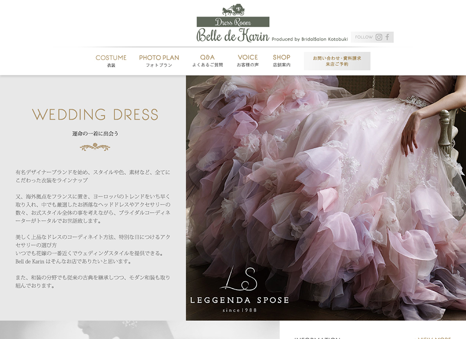 衣装レンタル専門店を経営されているブライダルサロン寿様の、ウェディングドレス専門サイトを作成させて頂きました。制作が進むにつれてTOPページに出さなくてはいけない情報がどんどん増えて難儀しましたが、うるさくならないよう、上品にまとまったデザインを目指しました。