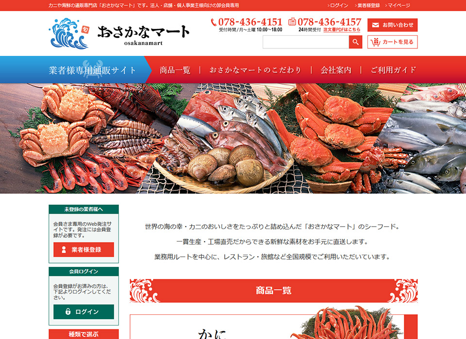 朝日共販株式会社様のBtoB海鮮通販サイト、おさかなマートを作成させて頂きました。ホテルや旅館の仕入れ担当者様がターゲットですので、「きっちりとした印象」と「明るい雰囲気」の表現を重視しました。商品一覧のバナーも大きくして、サイドバーを取り付け、見やすいデザインを心がけました。