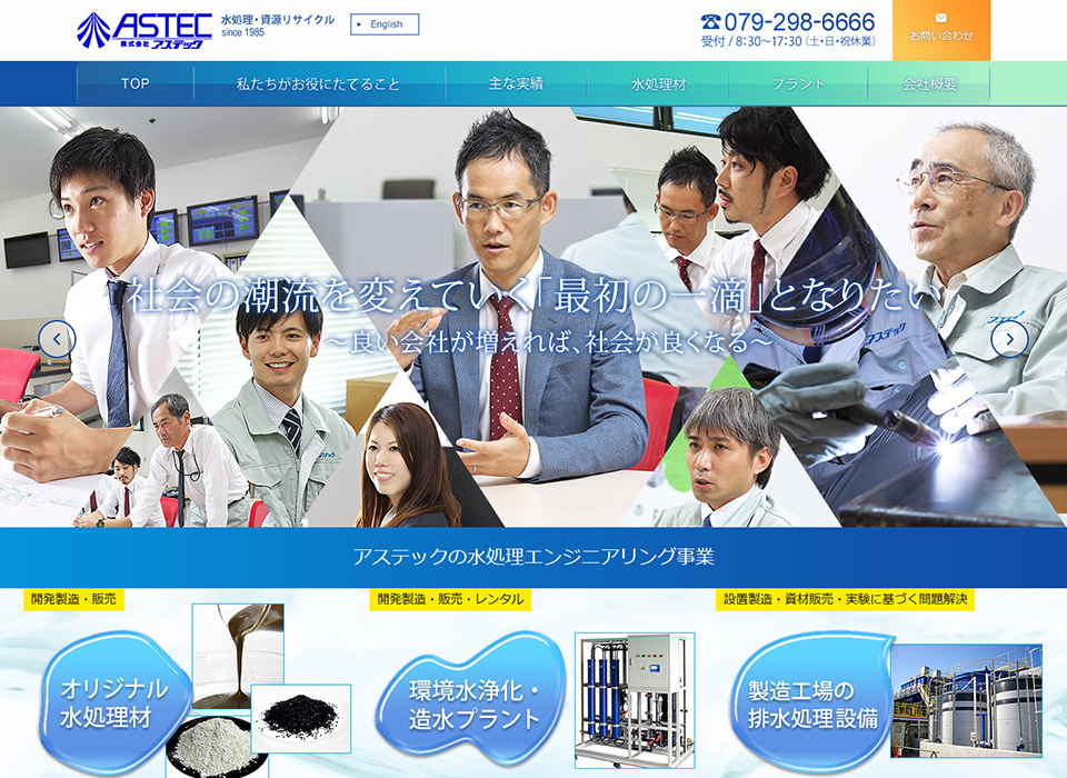 水処理や、それに使用する水処理材を研究・開発されているアステック様のコーポレートサイトをリニューアルさせて頂きました。水のモチーフをふんだんに作ることができて、とてもやりがいがあり、楽しかったです。水処理材のページは学術的な内容ですが、地元のひとが見てもわかるようにしたいとのことでしたので、図や写真を使用して、視覚的にもわかりやすくしました。