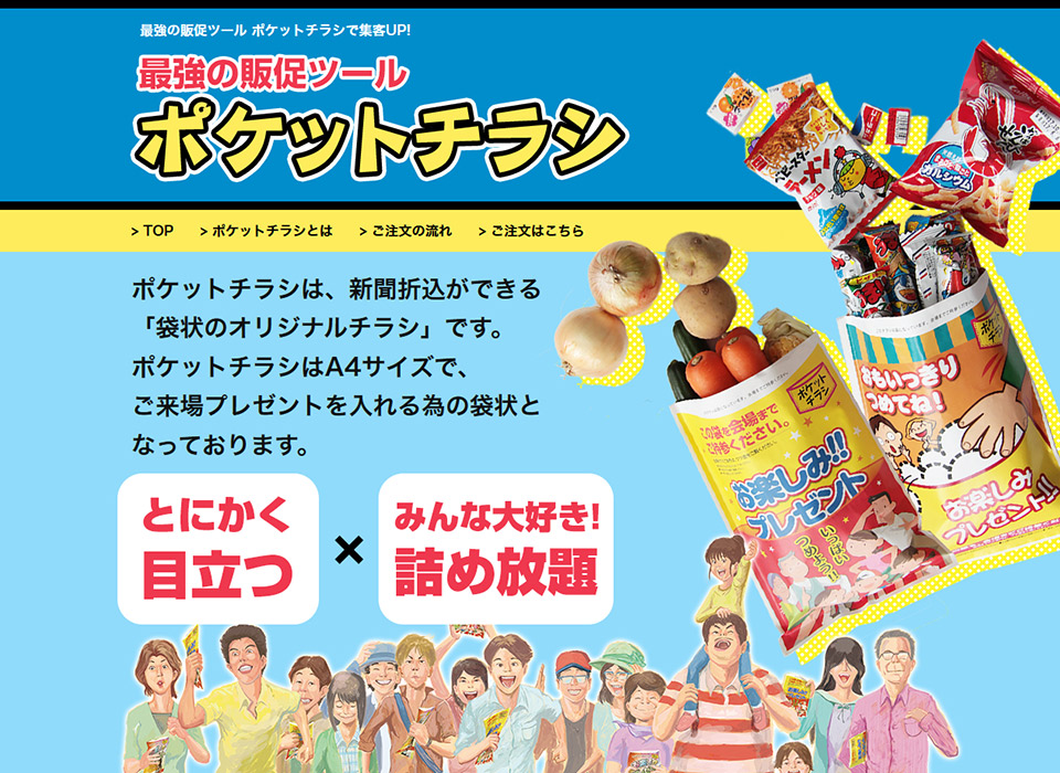 ポケットチラシ様のランディングページを作成させて頂きました。住宅会社や不動産会社などの「ファミリー層を相手に商売をされている業者様・企業様」をターゲットにした商品なので、デザインも楽しく、かわいく、明るい感じにしました。