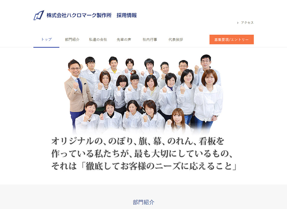 のぼり製作をされているハクロマーク様の採用サイトを作成させて頂きました。ハクロマークの社員さんにHTMLがわかる方がいらっしゃって、「自社で更新していきたい」とのことだったので、複雑ではなくシンプルな、けれども物足りなく感じないデザインに致しました。見るたびに更新されていて、確認するのが楽しみです。
